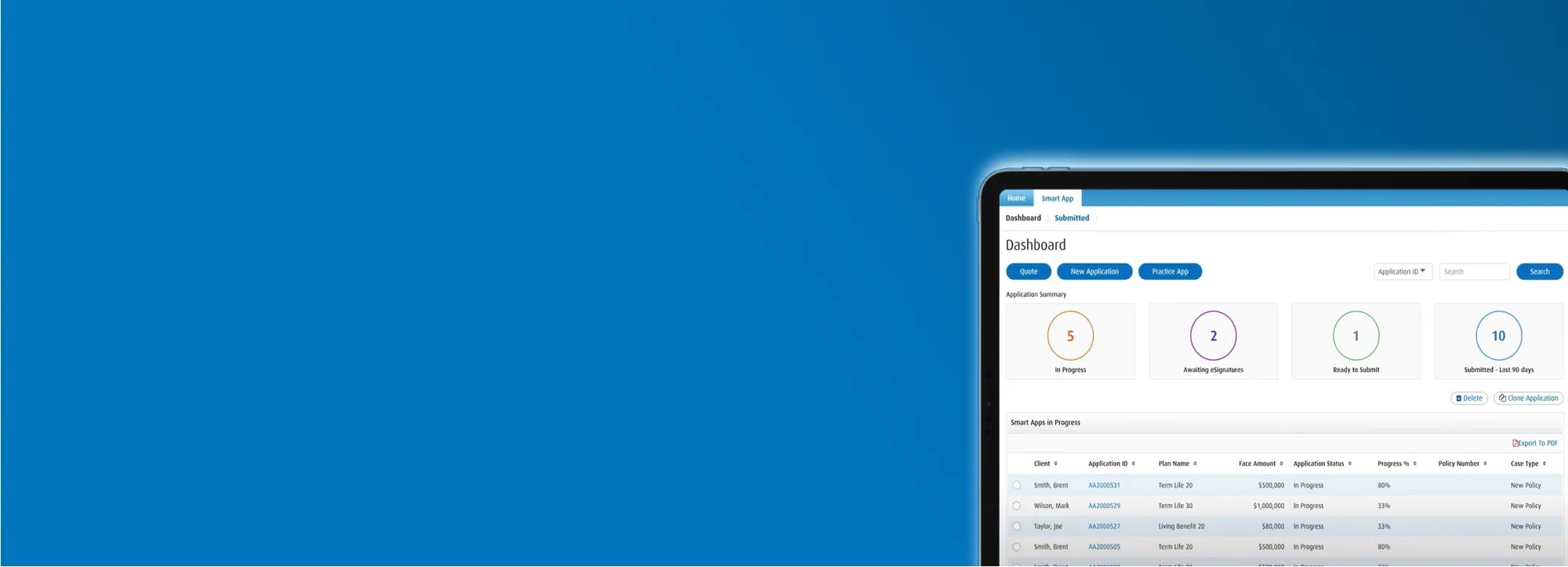 Your personal Smart App Dashboard provides you status of all your Smart Apps and helps you navigate through the application. Key actions like running a quote, starting a new Smart App, playing with Practice Apps or opening an In Progress Smart App are all done through the Dashboard.